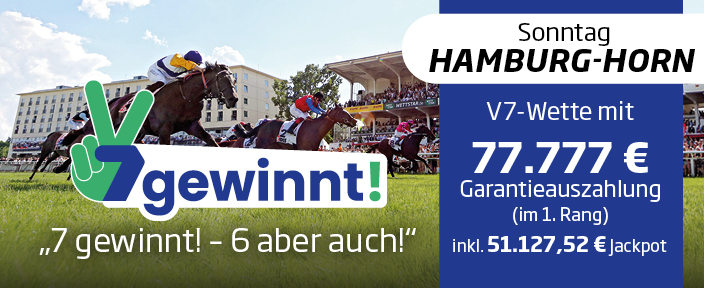 77.777 Euro winken in der „7 gewinnt!“-Wette im 1. Gewinnrang. Darin enthalten ist ein Jackpot von 51.127,52 Euro. Bei 6 Richtigen gibt es einen zweiten Gewinnrang. Ausgespielt wird die Wette in den Rennen 2,3,4,5,6,8,9 des Tages.
