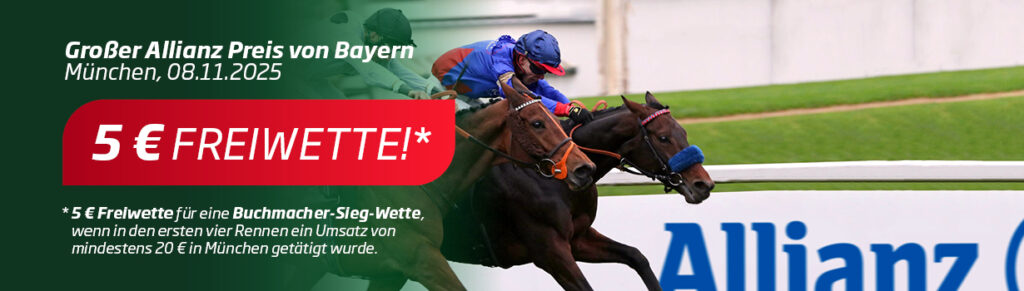 Wer in den ersten vier Rennen am 8. November 2025 in München auf WETTSTAR-PFERDEWETTEN.DE einen Wetteinsatz von insgesamt mindestens 20 Euro tätigt, erhält eine 5 Euro-Buchmacher-Freiwette auf Sieg für den weiteren Renntag (eine Freiwette pro Kunde).