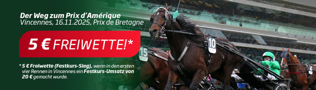 WETTSTAR bietet aus diesem Anlass eine Sonder-Aktion: Wer in den ersten vier Rennen am 16. November 2025 in Paris-Vincennes auf WETTSTAR-PFERDEWETTEN.DE einen Festkurs-Umsatz von insgesamt mindestens 20 Euro tätigt, erhält eine Freiwette in Höhe von 5,- Euro für eine Festkurs-Siegwette in Vincennes geschenkt (eine Freiwette pro Kunde).