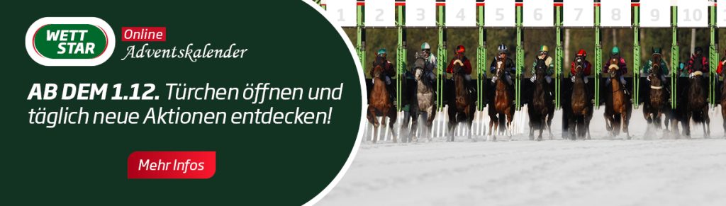 Der 1. Advent in Daglfing startet ab 14:30 Uhr und lockt ab dem 2. Rennen mit einer ...V6-Wette mit einer Garantie in Höhe von 15.000 EUR (inkl. 4.253,60 EUR Jackpot). Mit dem 6. Rennen startet dann zudem die V3-Wette des Tages mit einer Garantie von 2.000 EUR.